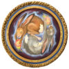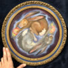 Medium: oil on archival paper over wood. Flowers and eyes have gold paint accents. Vintage frame is gold with blue-color trim circle.