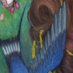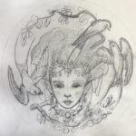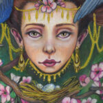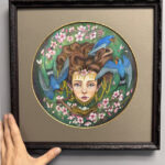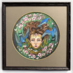 Medium: color pencils on illustration board, added gold embellishments to jewelry and blossoms. Custom round mat with added gold edging. Custom frame that includes glass covering.