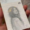 I have a precious small collection of these cards (which are no longer used by libraries in decades, so they’re a very finite resource), and every so often I pull out a few and make art on them. Every single one is hard to let go, but it’s also wonderful to see how every one of them connects with a different person in a special way. I love the charmingly crooked dot-matrix printed label on this one, and the unintended poetry of the title. I couldn’t resist putting some golden stars in the lady’s hair to echo it.