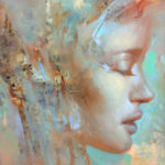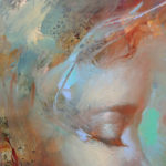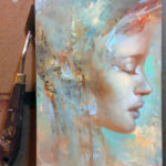 Sylvia is an oil painting on gessoed masonite, and measures 5×7″. There are a few layers of paint and textures built up. The abstract marks are inspired by the forest and sky, and the light that comes through between the branches and above the tree tops.