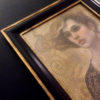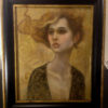 Handmade paper from Nepal with it’s rich texture and gold leaf provides the perfect surface for this piece. I let the tendrils of the paper influence the push and pull of paint density and edges. The paper is sealed on a wood panel. The black and burnished gold frame compliments the surface and palette of the portrait.