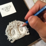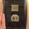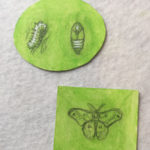This shadowbox is the 2nd piece in my series of insect miniatures. The theme focuses on three main stages of North America’s largest native, the beautifully colored Cecropia moth. The larva as a caterpillar reaches over 4 inches and is a bright green, dotted with a pattern of colors. The pupa in my tiny painting is what the creature looks like outside of it’s silk cocoon. As an adult, the wings can be as wide as 6 inches, with red-orange furry bodies and crescent-shaped eye spots.