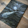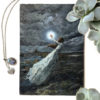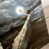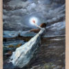 This is a small painting about a young witch guiding a lost soul to a deserted lighthouse. The witch herself has now become a lighthouse or beacon of light. She believes the old lighthouse keeper still lives in the forlorn building. The lighthouse keeper holds important information which will help our traveller return home. The traveller is lost in a magical realm.