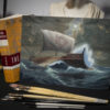 This 9×12″ oil on canvas board is a study in subject matter as part of an ongoing series of works exploring The Odyssey. This particular image is inspired by the text above, in which Calypso is relaying a warning to Odysseus of the fate that awaits him on his voyage. Accepting fate and persisting through it is a recurring theme in this classic Greek myth.