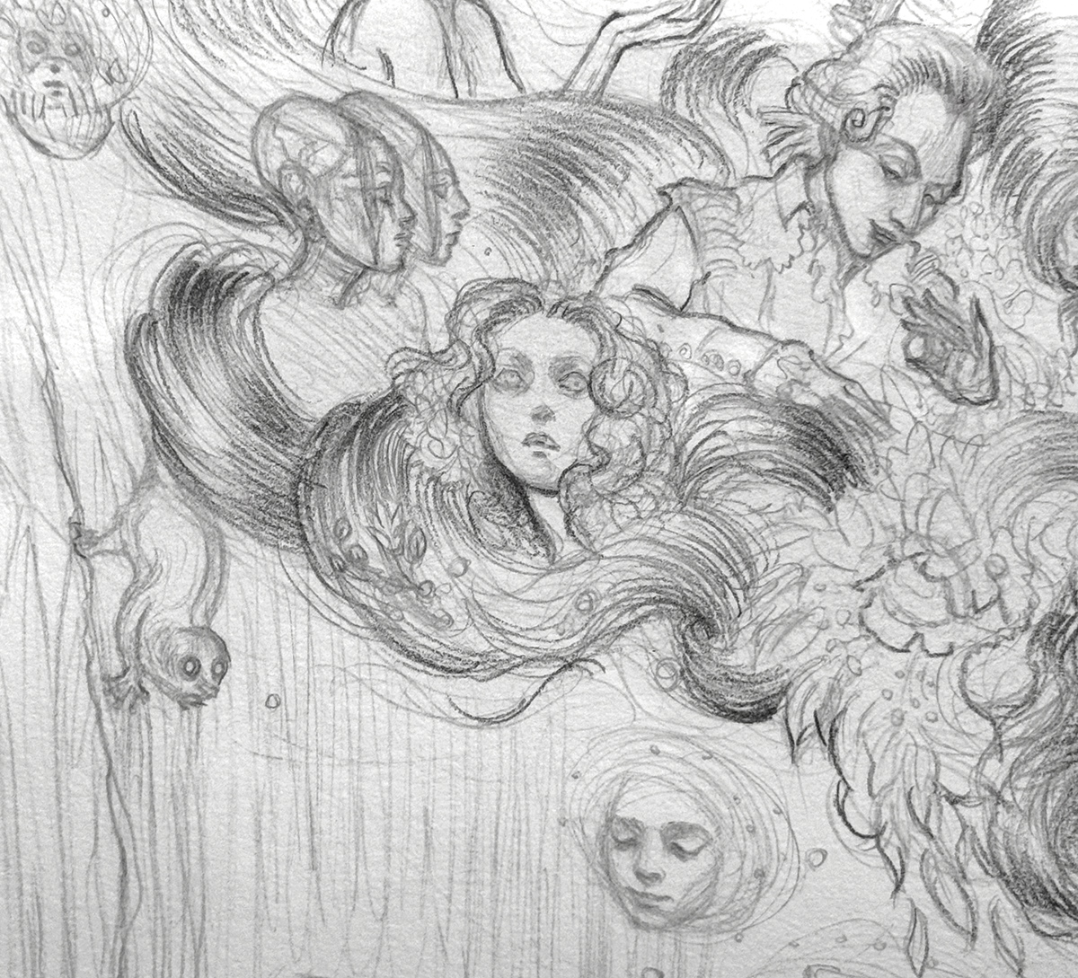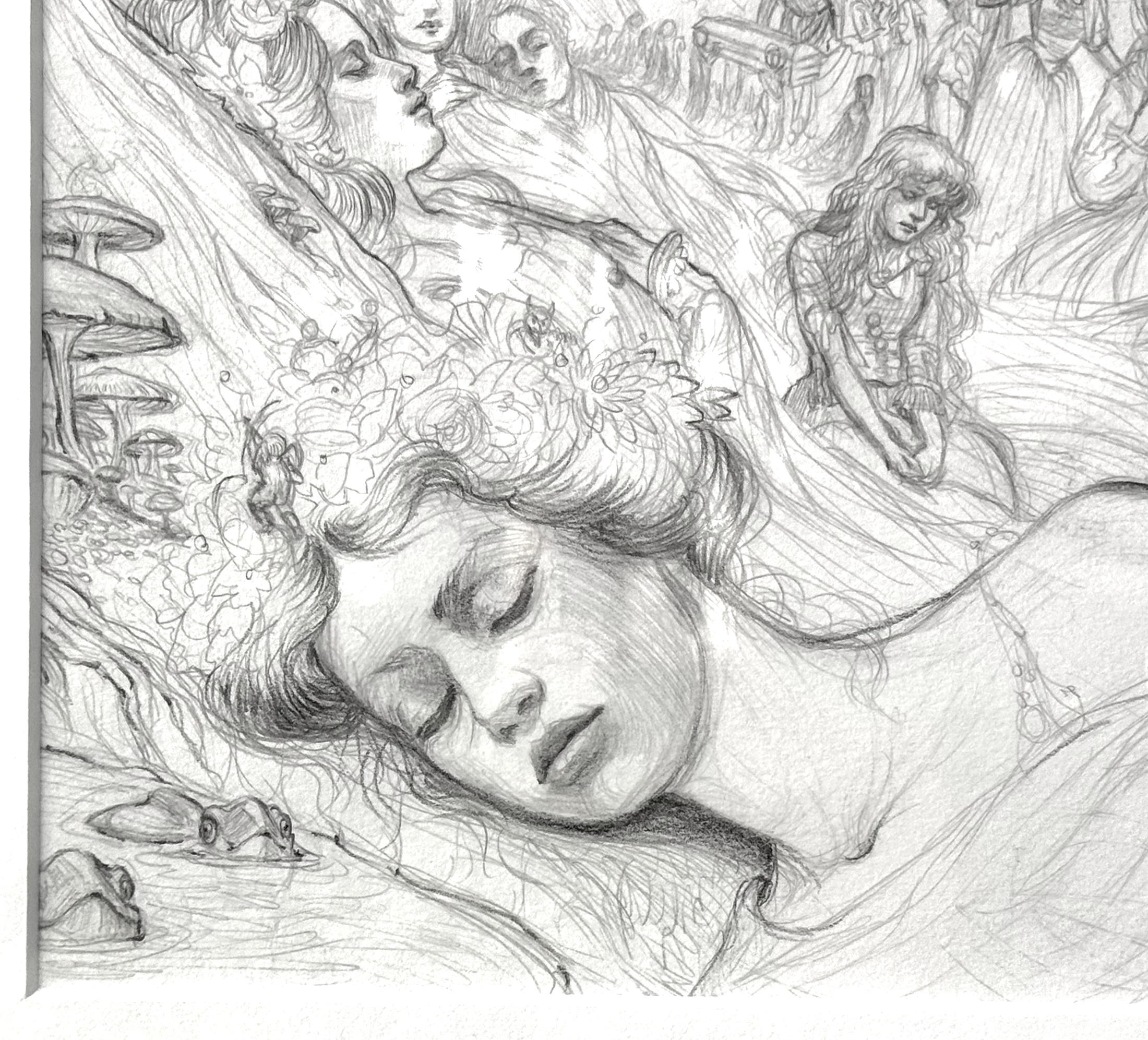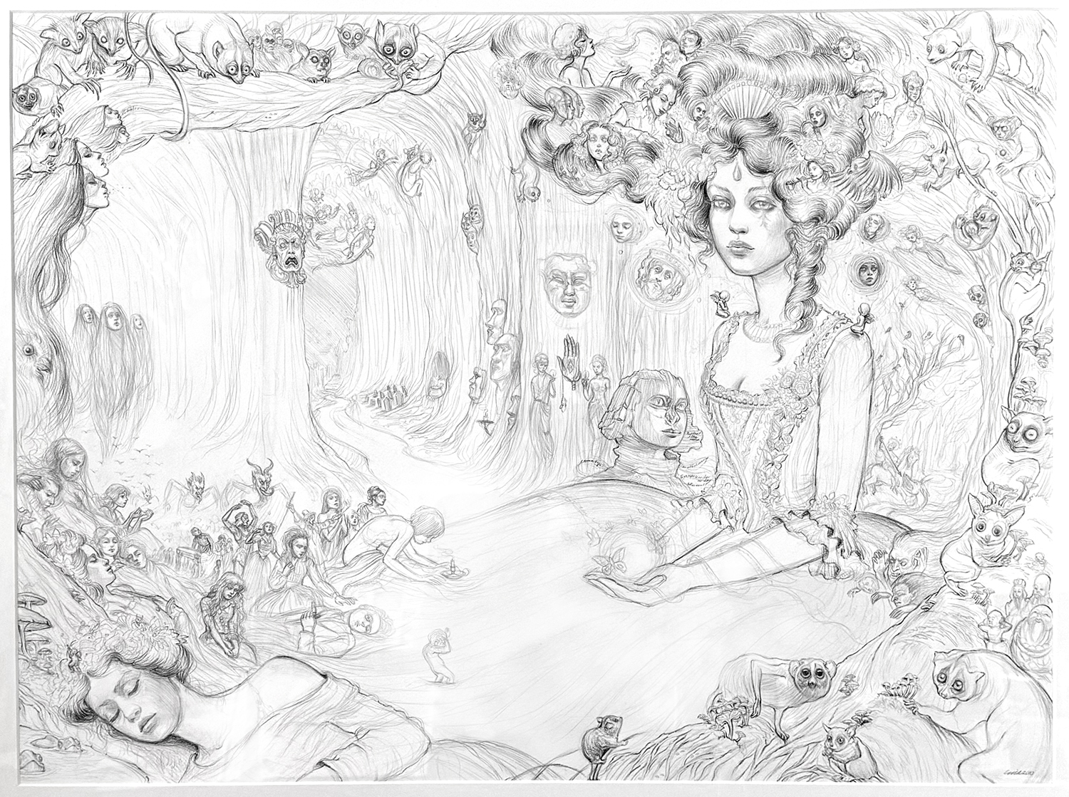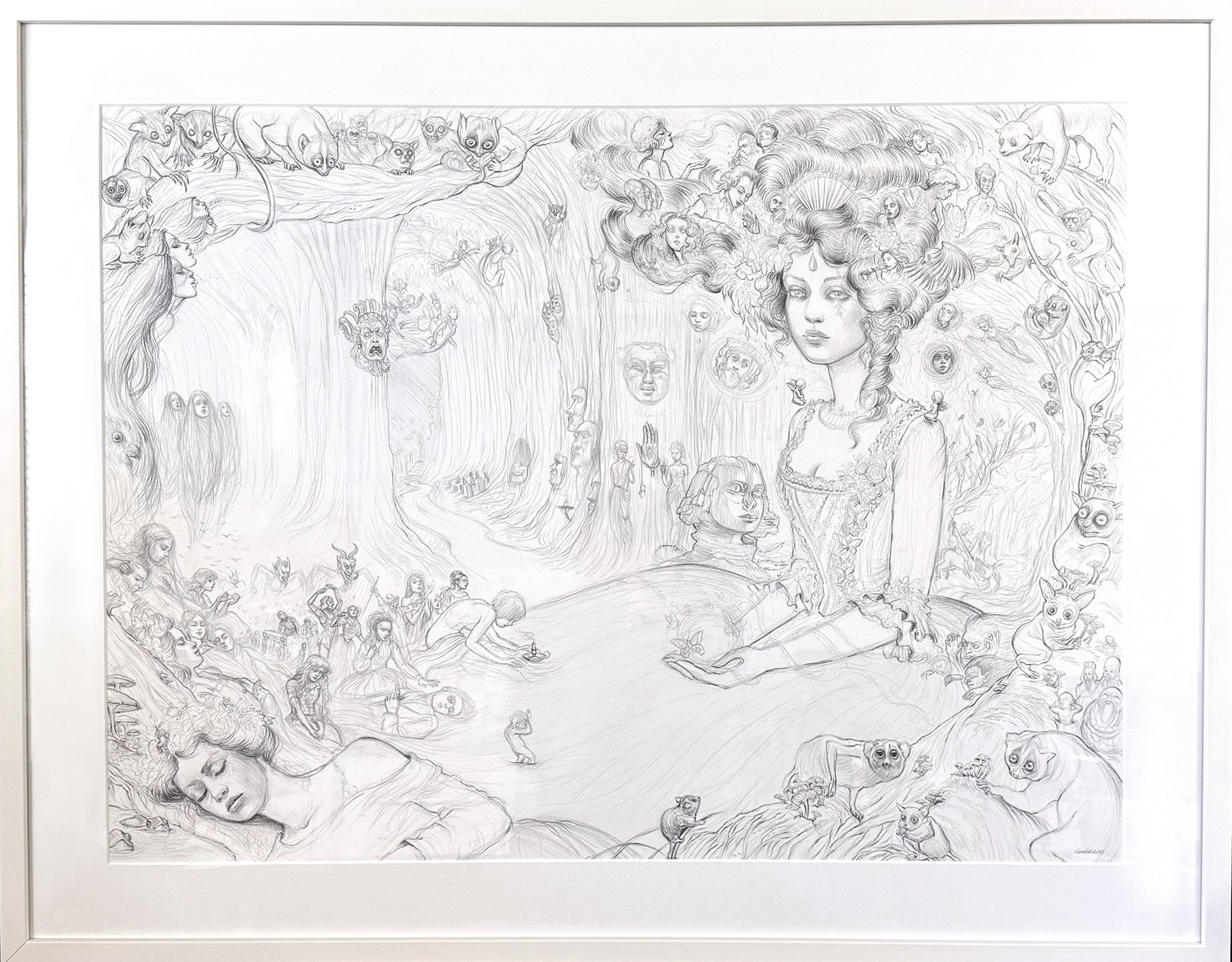 A rare original drawing from my gallery days–this was the preparatory drawing for my acrylic painting of the same name, created in 2010. This is my take on “The Priestess” tarot card. The nocturnal animals and sleeping figures surrounding her symbolize seeing into the depths of your own psyche and the inner awakening that comes from self-knowledge. All kinds of hidden imagery in this one, like St. George and the Dragon, Le Spectre de la Rose, and the Great Sphinx. The drawing comes beautifully matted and framed in white.