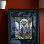The artwork is framed in a dark grey frame. Both frame and mat have been embellished by the artist to suit the theme of the piece.