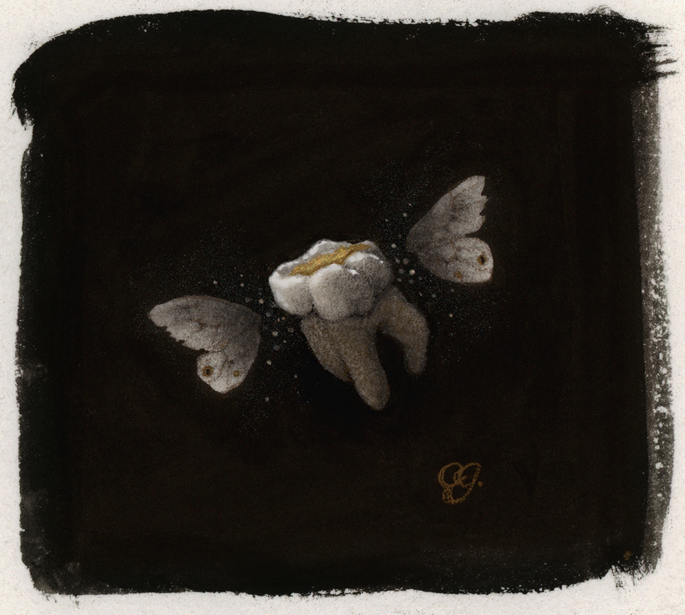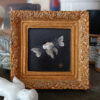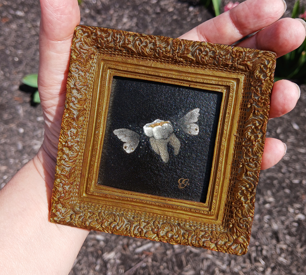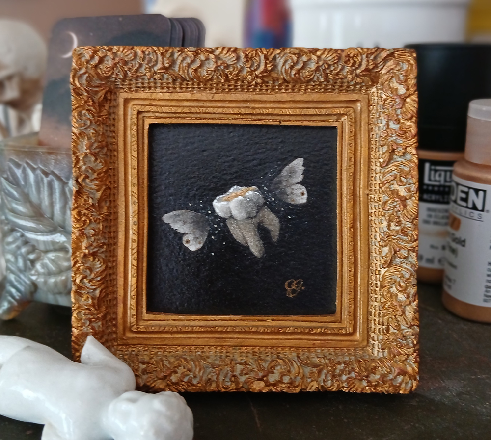 Iridescent acrylic forms the basecoat, then I went in with matte graphite pencil and a touch of gold. Lastly, the background is water-soluble charcoal, which lays down a luscious black. (This one was made from cherry pits, which has a bit of warmth to it.) After coating it with varnish, I tucked it into a fancy little gold frame. Voilà!