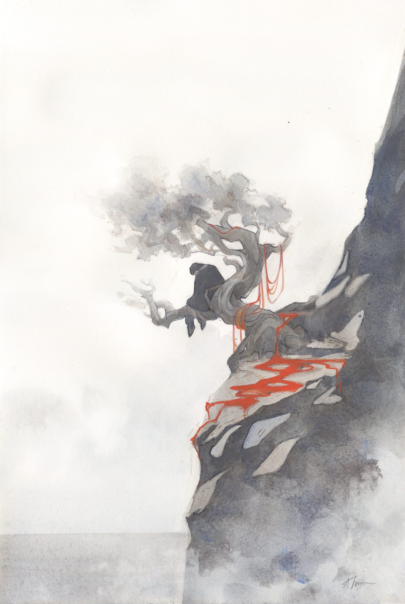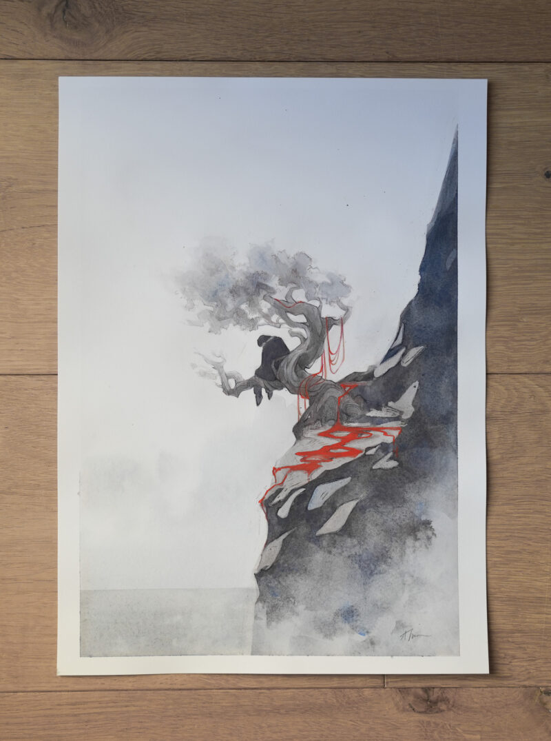 This was my entry to the Folio Society 2024 Illustration competition, inspired by the short story “The Truth is a Cave in the Black Mountains”. I really enjoyed experimenting with very wet media for this piece, letting the bleeding pigments dictate the mood. This is a rare non-portrait from me!