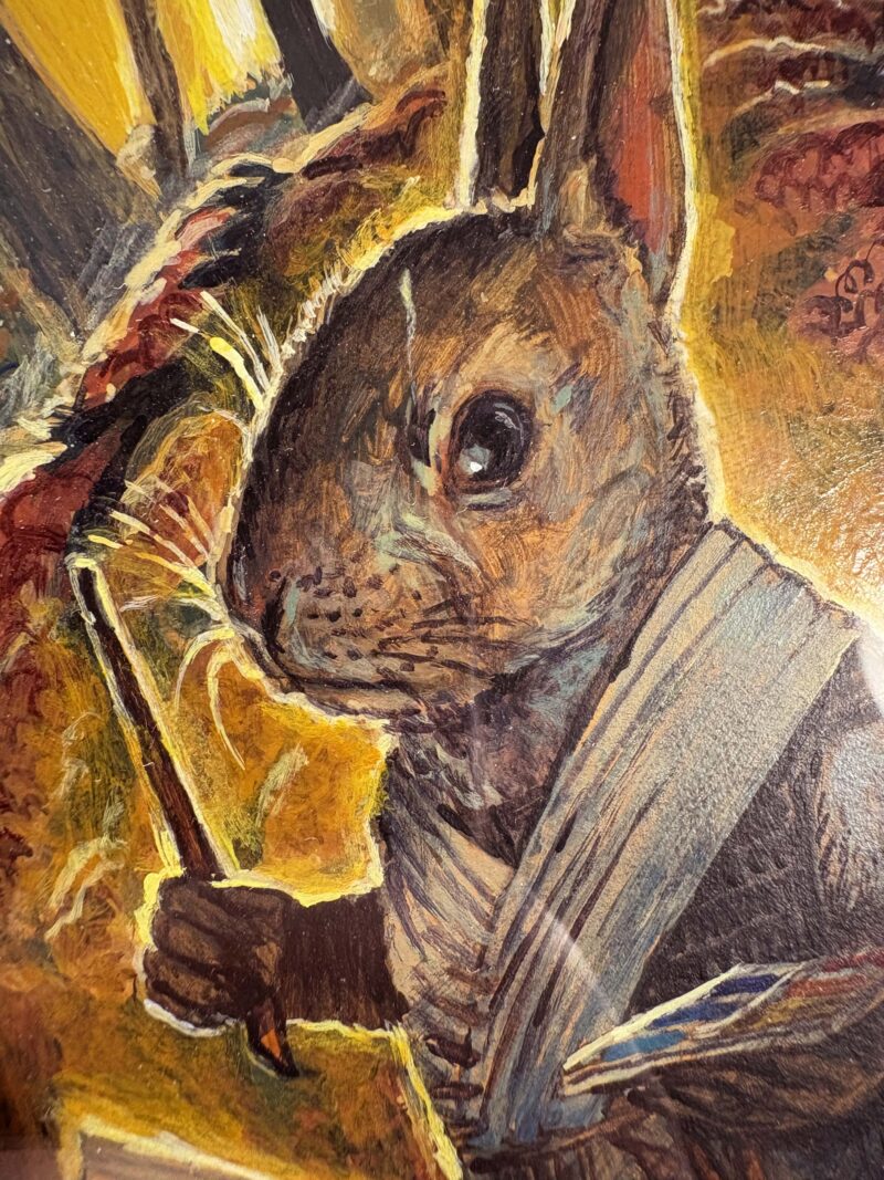 Art is 4 x 6 inches. Comes fully framed in a rather ornate gold-ish frame with a circular top.