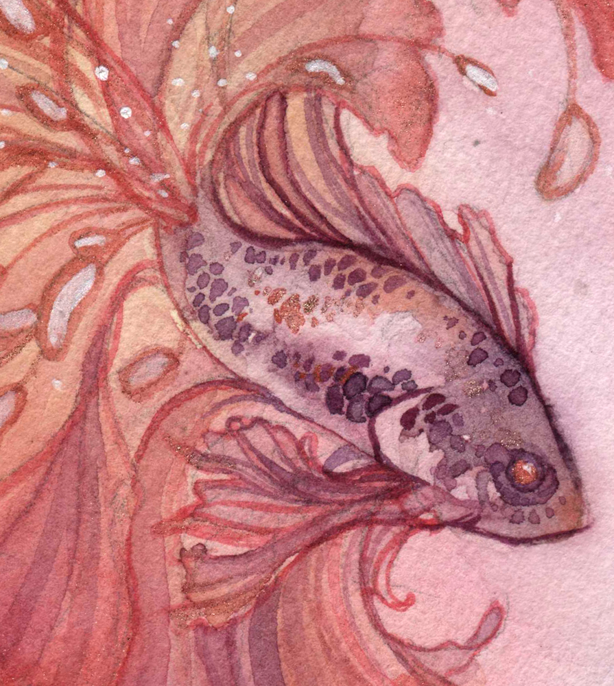 No, I did NOT resist adding gold shimmer to my fish. How *could* I? She is watercolor and gold shimmer on cotton 140lb paper, and she’s much more fabulous than any photo can really show.