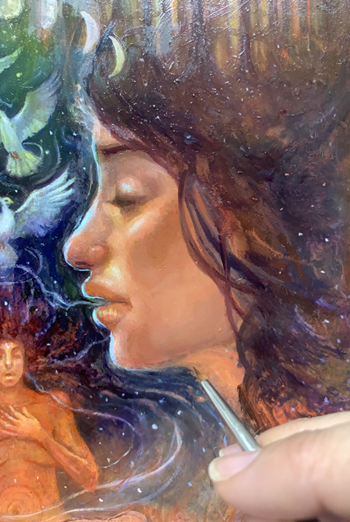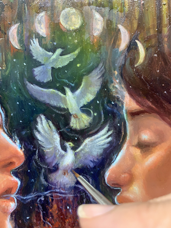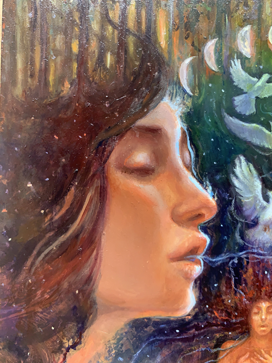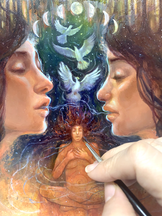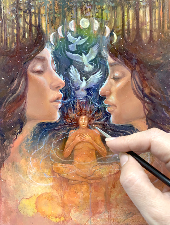 This painting called “Transformation” was created for an oracle deck I am illustrating for hynotherapist Kristin Dwan, and is about the sacred act of chanting as a means of inner transformation. Chanting is an ancient practice for softening the mind and opening the spirit. A repeated sound, spoken again and again, carries us out of ordinary thought and into a quieter rhythm. Like the cycles of the moon, the turning of seasons, or the breath of the forest, this repetition reshapes us. What begins as something simple becomes transformative, weaving through body and spirit until we feel ourselves connected to the vast patterns that hold us all.