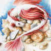 Betta fish are famously territorial and aggressive, so in my dragon fish series, I wanted to both showcase their beauty and hint at their protective and possessive nature. While painted in acrylics, I approached this piece much as I would a botanical illustration in watercolors, slowly building up color in thin layers – but then used acrylics with heavy brush strokes at the very end for final touches.