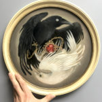 Art measures 11 x 11 inches plus frame, which is a lightweight vintage wood. Centerpiece and eyes are embellished with gold reflective paint. I’ve chosen a position for it to hang, but it can be rewired to face any direction.