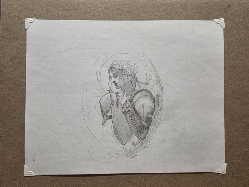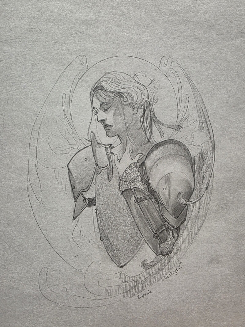 After the battle a Valkyrie contemplates deeds done. Graphite on 8.5×11 paper.