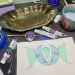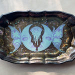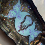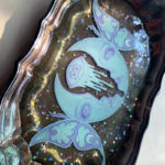 “Waxing and Waning” is a mixed media piece measuring 7.5″ x 12.5″ and created with acryla gouache on paper with resin, glitter, and an antique silver plate tray. When the light catches the tray, the gorgeous patina of the silverplate shines against the painting resting within layers of resin.