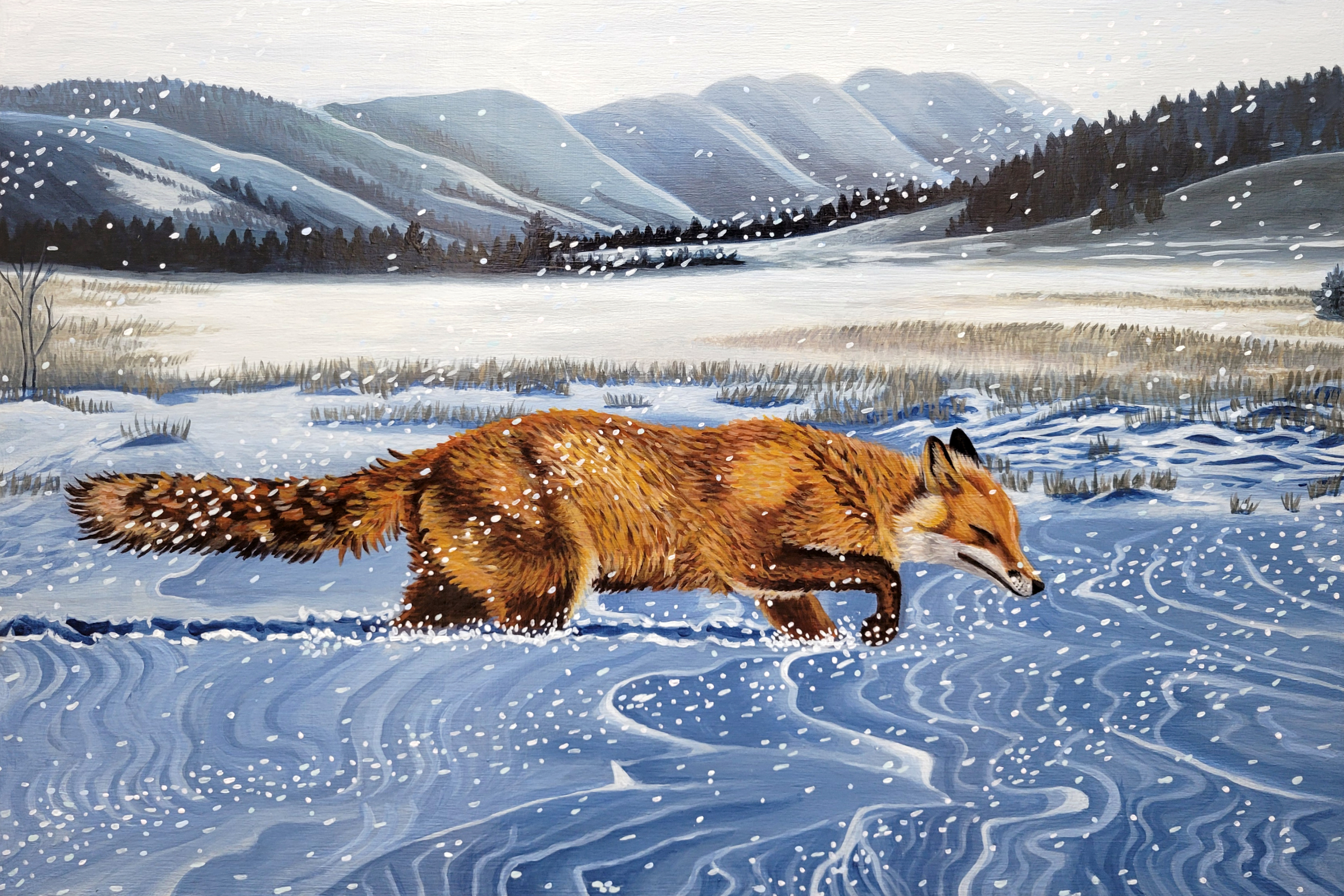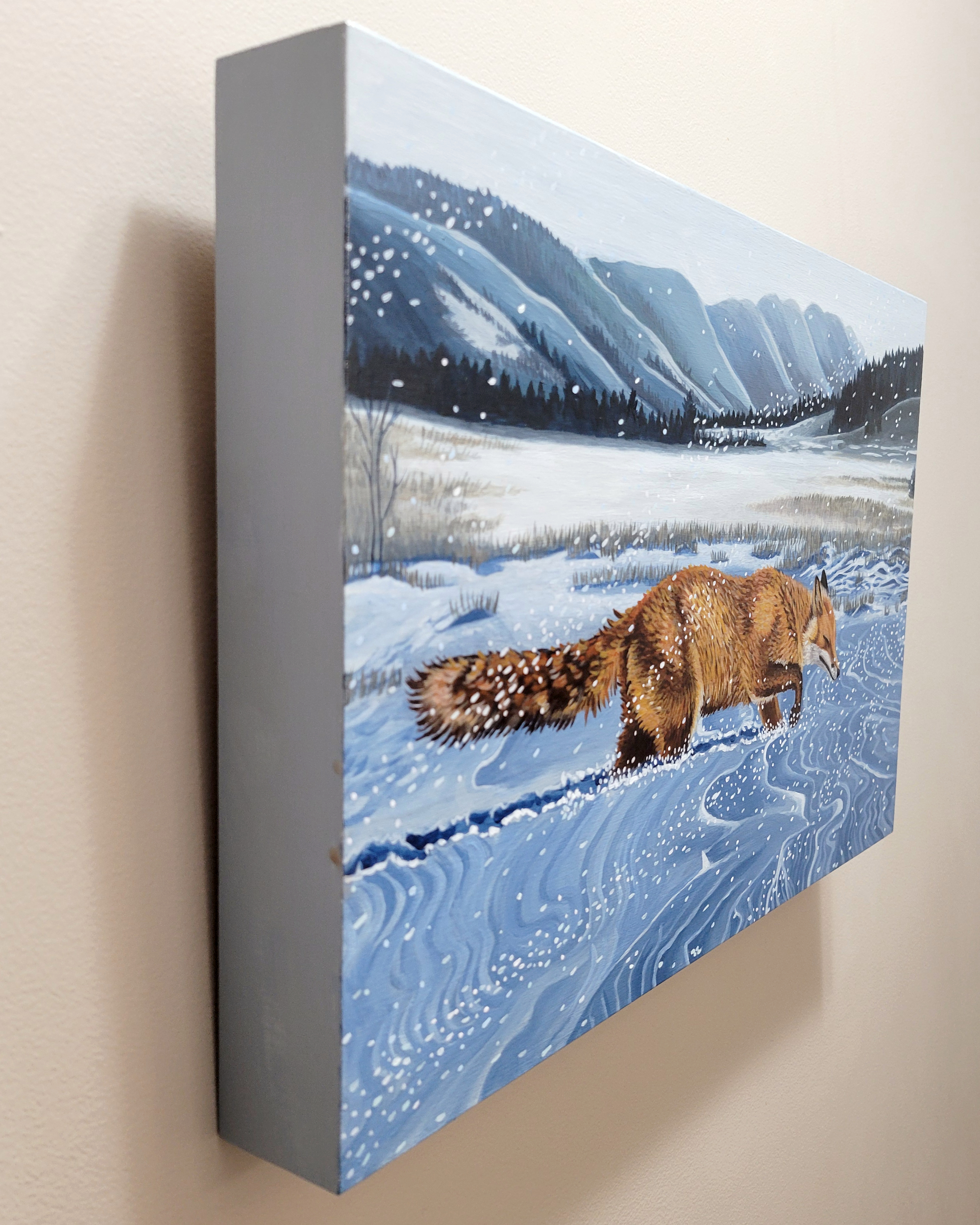 This painting is on birch panel, measuring 18″ x 12″ and the edges are painted. The back has a wire for hanging.