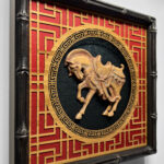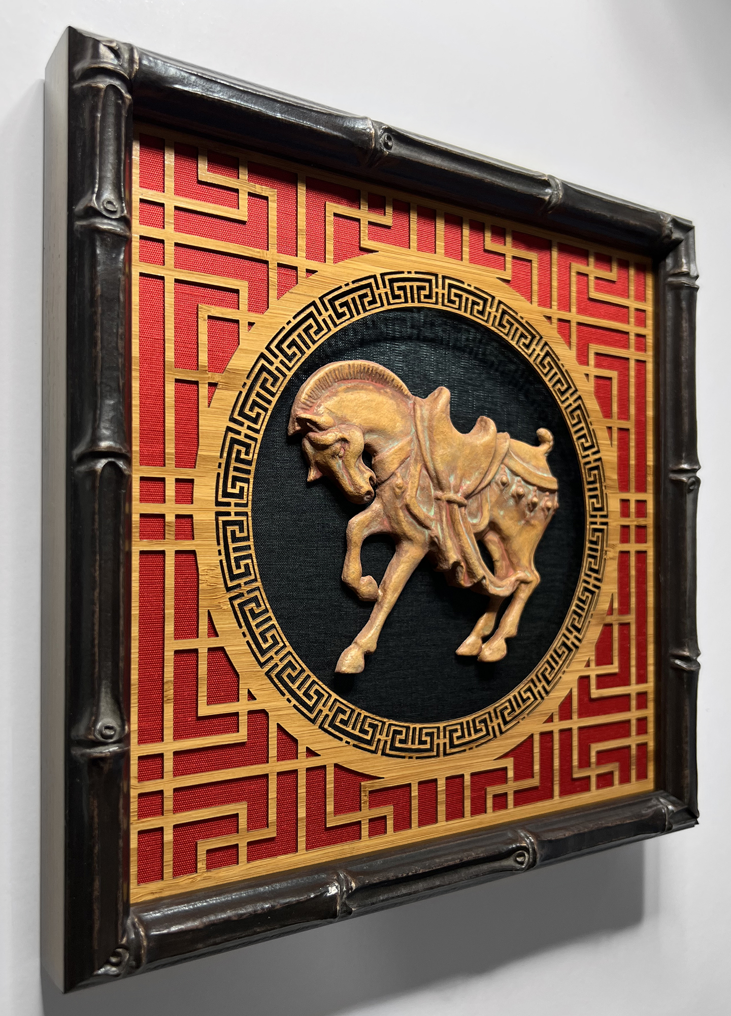 In the Lunar New Year cycle, the year of the horse focuses on action and positive change. This year the accompanying element is fire, indicating that it is time for big changes and bold action. This piece depicts the horse in stride, ready to move forward, surrounded by fiery red silk and laser cut bamboo veneer surround. The horse is cast paper in a mold of my own design, and painted with granulating watercolors that shift red and pale teal. I wanted the piece to look like an ancient artifact framed and displayed with pride. The piece is finished in a black faux bamboo frame with antiglare museum glass. I sincerely hope this year brings positive changes, and that this horse will bring you luck!